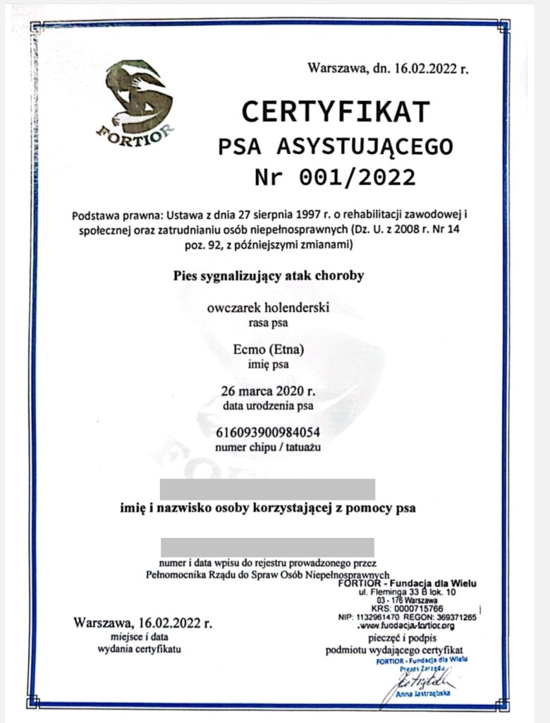 Wczoraj otrzymaliśmy niecodzienną, ale jak wspaniałą wiadomość: ETNA (Ecmo) Bella Sama, niespełna 2-letnia sunia po Duco x Ufi, została certyfikowanym psem asystującym. Jest jednym z pierwszych psów w Polsce posiadających uprawnienia jako pies asystujący-sygnalizujący atak choroby.